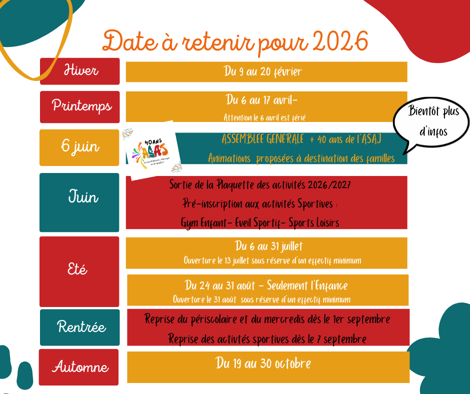 Date à noter dans vos agendas : Le 6 juin 2026 nous préparons une grande fête à l’occasion des 40 ans de l’ASAJ !!!